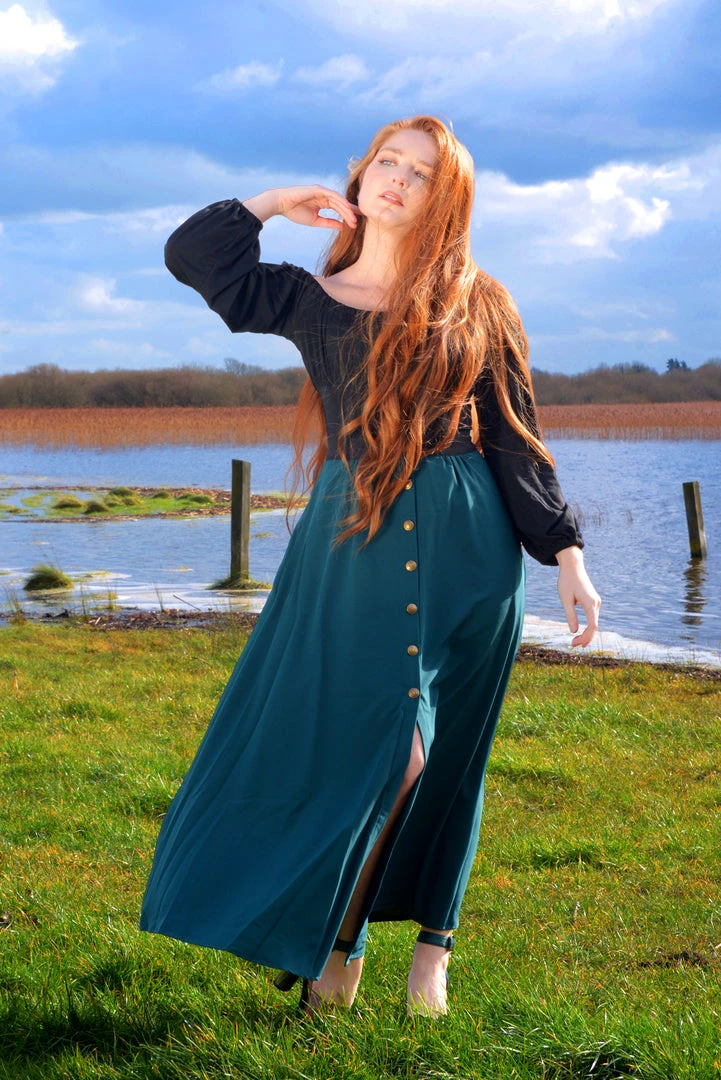 Created by designer Laura Byrnes, we present you the Selene Midi Skirt. This skirt is something truly magical, fully lined in a flowy stretch crepe material, and featuring buttons at the front, a back elastic band, and pockets. Skirt is midi length, designed to sit at the lower calf for humans 5’10” and taller, and at the ankle for humans 5’7″ and shorter.