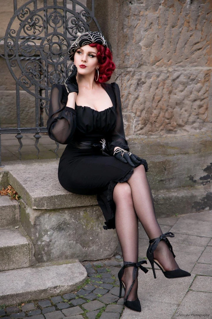 As supernaturally stunning as the muse who inspired this dress, the Aziza Dress will bring benevolent fashion magic to your vintage inspired wardrobe. Chiffon sleeves lend ethereal allure to this darkly romantic wiggle dress, which also features a gathered chiffon bodice for a flirt of cleavage and skirt hem highlighted by a ruffled chiffon embellishment. This combination of ponte and chiffon offers a fitted silhouette that looks positively decadent in this very vintage, very vamp-inspired dress. The Aziza dress is finished off with a back zip and double kick pleat to make wiggling in and out of it an easy process.