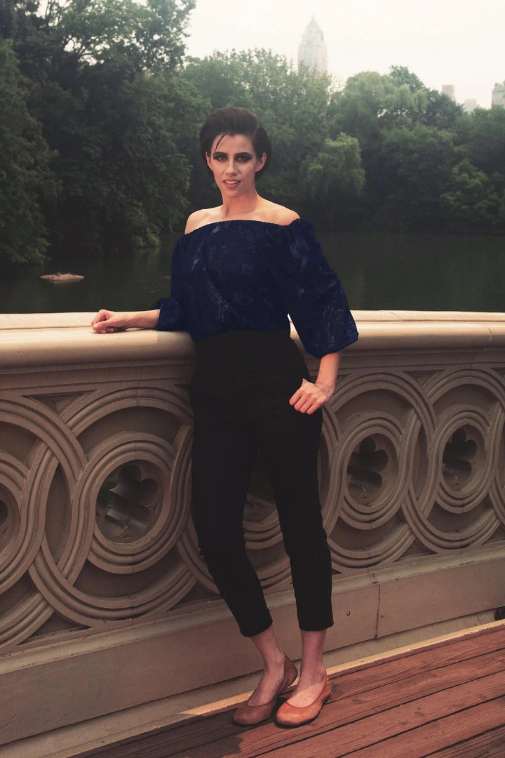 The Sylvie Long Sleeve Peasant Top is unlined in a 3% spandex stretch poly crepe and featuring roomy bishop sleeves, an unfitted, roomy bodice and an elasticized neck.