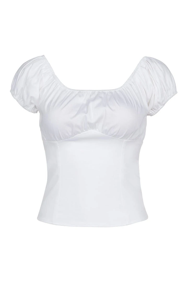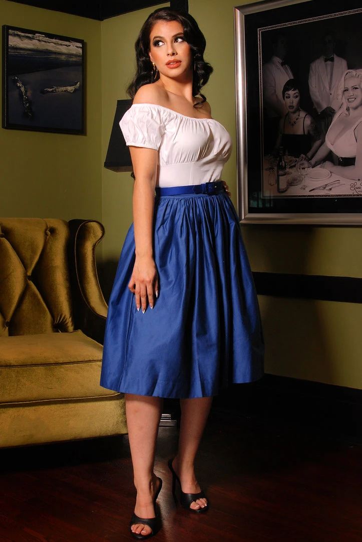 Our Pinup Couture Peasant Top is the perfect little separate you never realized you needed until you were wearing it multiple times a week and collecting every color. Wearable up on the shoulders or shrugged off, there’s ample room for any size bust, and a zipper that goes from the underbust to an inch above the hem for easy over the head access. It’s long enough to tuck in, but not so long that you can’t wear it untucked with a pair of Laura Byrnes California Denim Capris. Made out of ultra-comfortable white sateen, the fabric will form to your body, and the curved under-bust seam on the gathered bust will keep you held in and up. Pair with a skirt, pants, and whatever else you’d like – it goes with everything!