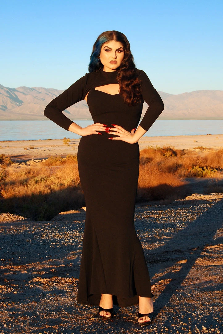 Bold, sensual and unapologetically glamorous, the Supreme Gown in chic Black Stretch Crepe embodies all the best things about her namesake. Designed by Traci Lords in collaboration with Pinup Girl Clothing’s Supreme Creatrix, Laura Byrnes, this gown will quickly become your formal favorite. Fashioned from stretch crepe that hugs your curves and flows into a spectacular fishtail hem. Adjustable straps allow you to achieve the comfortable fit you need and the removable shrug adds a flirt of cleavage and makes this a fantastic gown for both winter and summer events you need only add your favorite glittering accessories, this is the dress you’ll wear only if you want to light the room on fire!