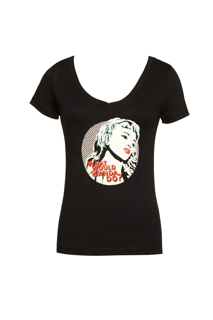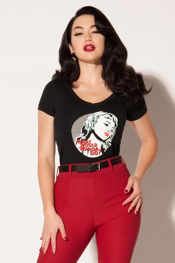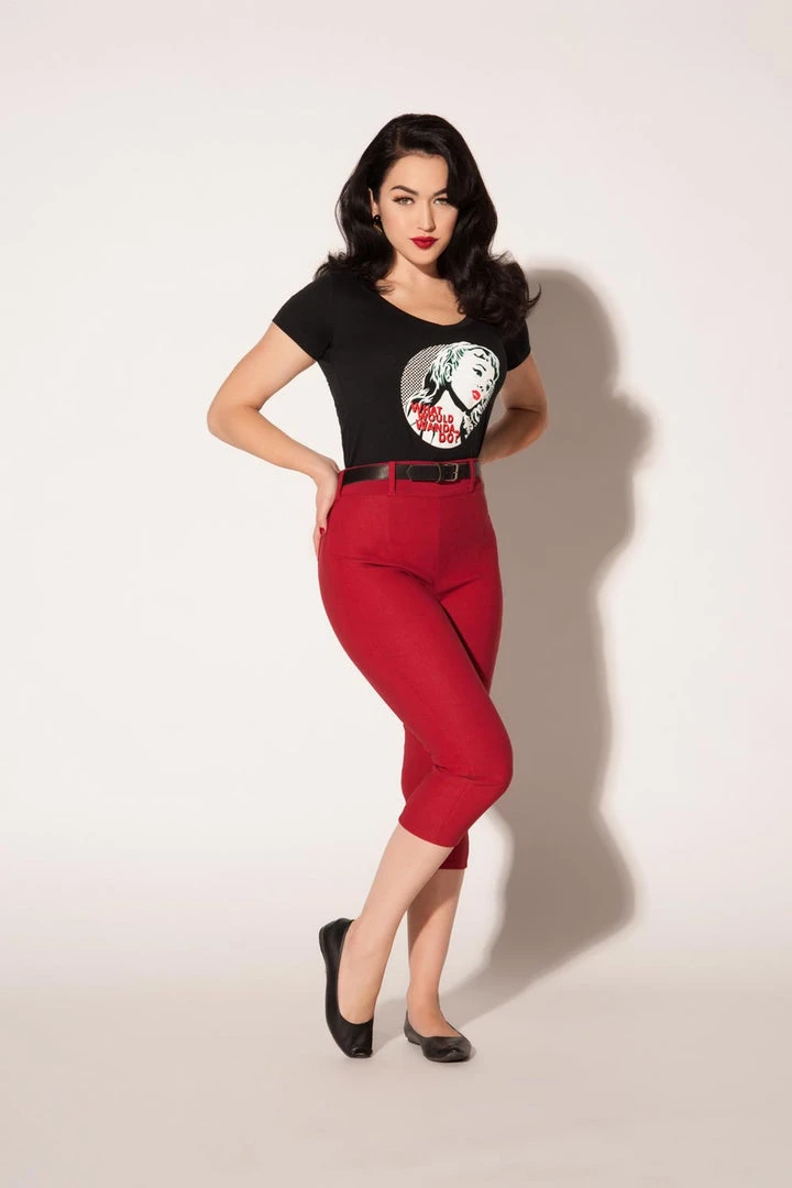 Got a problem? Ask yourself ‘What would Wanda do?’ then put on this bad ass T-shirt, some cherry red lipstick and kick some butt! Folks will know you mean business in this Traci Lord’s approved t-shirt from Couture for Every Body. Featuring an iconic portrait of Wanda–by Wanda herself, Traci Lords and artist TapedoffTV– in a perfect shade of juvenile delinquent black, you can wear this tee tucked into your favorite pencil skirt, high waisted pants or over your brand new Love Your Body Capri Jeans.