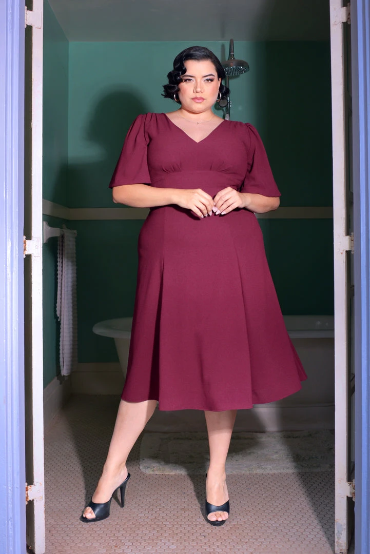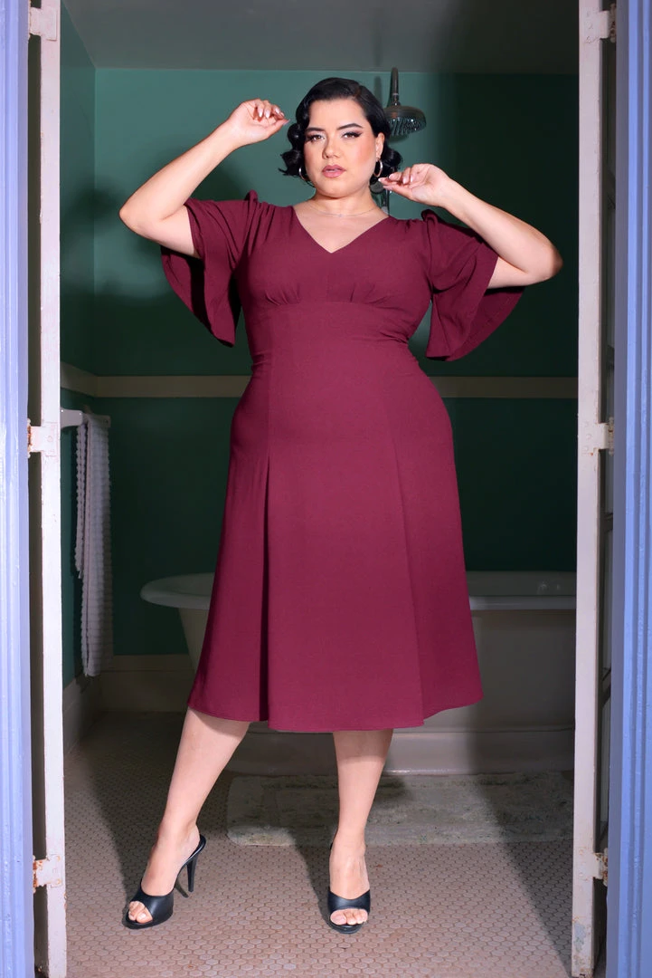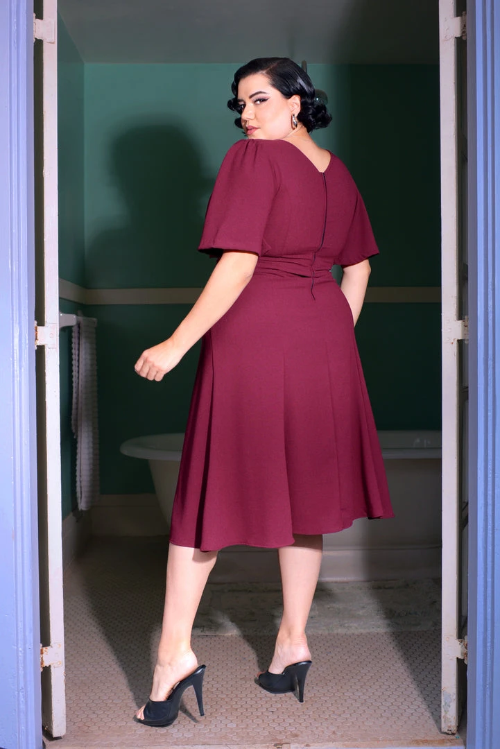 Featuring wide flowing bell sleeves and back zip, with V-neckline that is accentuated by gathers under the bust. The fit and flare silhouette has seaming running from the base of the bust down to the hem. Lined in the bodice and skirt in comfortable knit fabric.