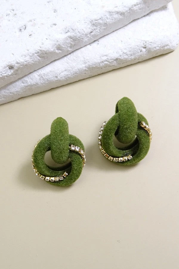 Interlocking ring stud earring featuring rhinestone accent and a velvet like texture.