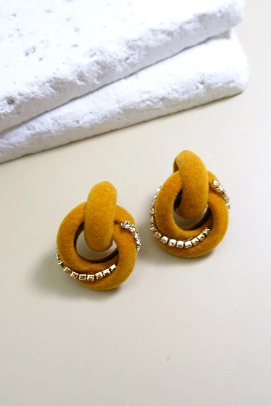 Interlocking ring stud earring featuring rhinestone accent and a velvet like texture.