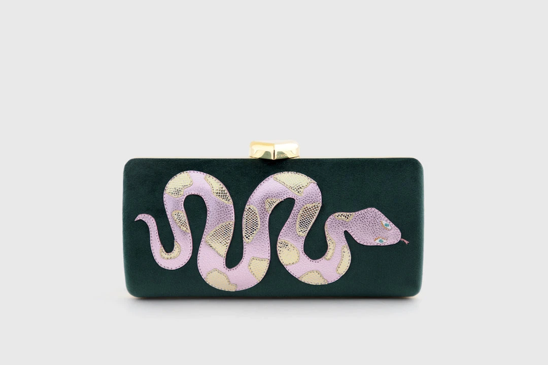 This soft green velvet clutch is adorned with a slithering pink and metallic gold leather snake with gold-plated bronze closures, and conceals within a detachable shoulder chain. Hand crafted in Peru.