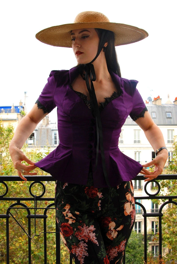This gorgeous fitted Victorian-style top from Laura Byrnes is made from the highest quality 97% cotton 3% spandex stretch twill and features a button front, lace lined neckline, cap sleeves, and a peplum silhouette, with ties at the back to create a corseted look.